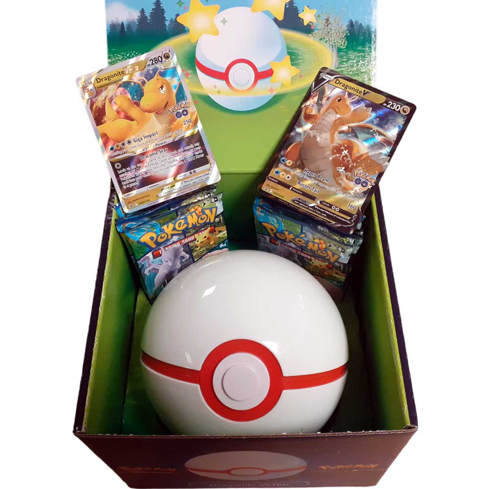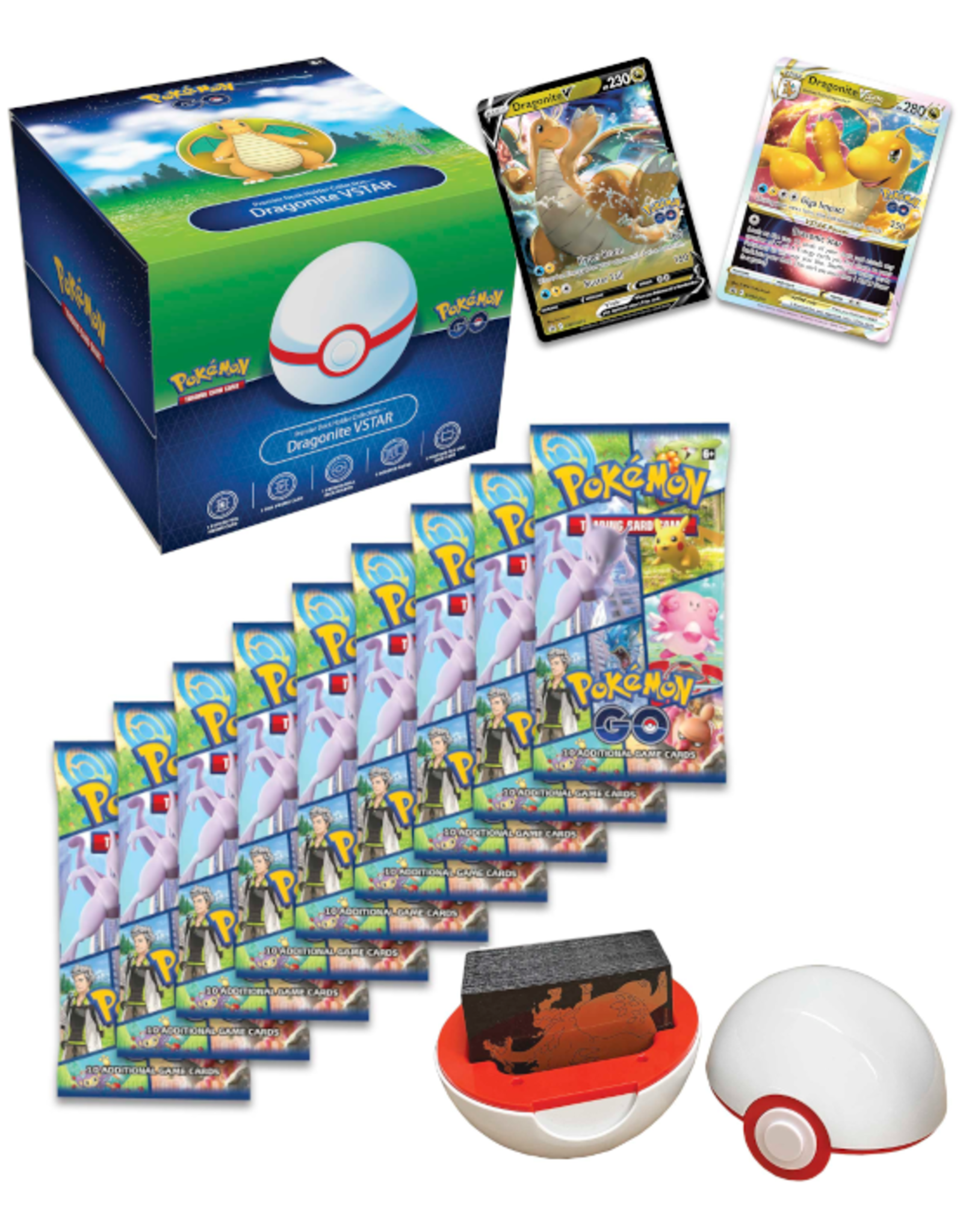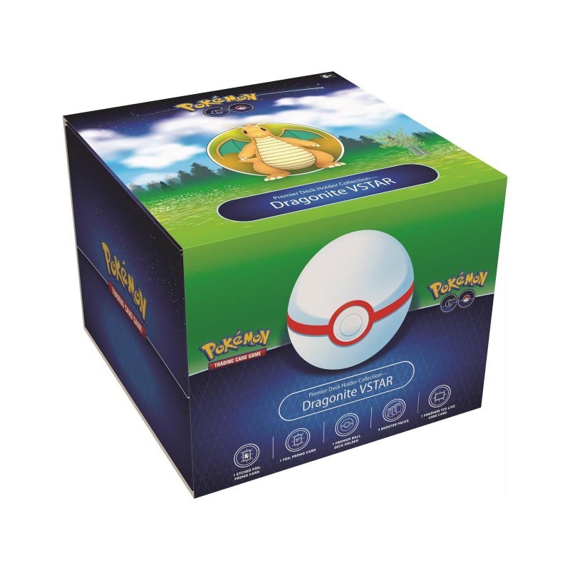 An epic Raid Battle brings mighty rewards: a powerful Dragonite VSTAR for your collection and a Premier Ball holder for your favorite deck! With a VSTAR Power that shares loads of Energy with your Pokemon, Dragonite VSTAR soars to strategic heights, and you'll receive it along with Dragonite V in this special collection featuring the Pokemon TCG: Pokemon GO expansion. To top it off, the sturdy Premier Ball case holds a fully sleeved deck of cards for an ultimate statement of Pokemon Trainer style!